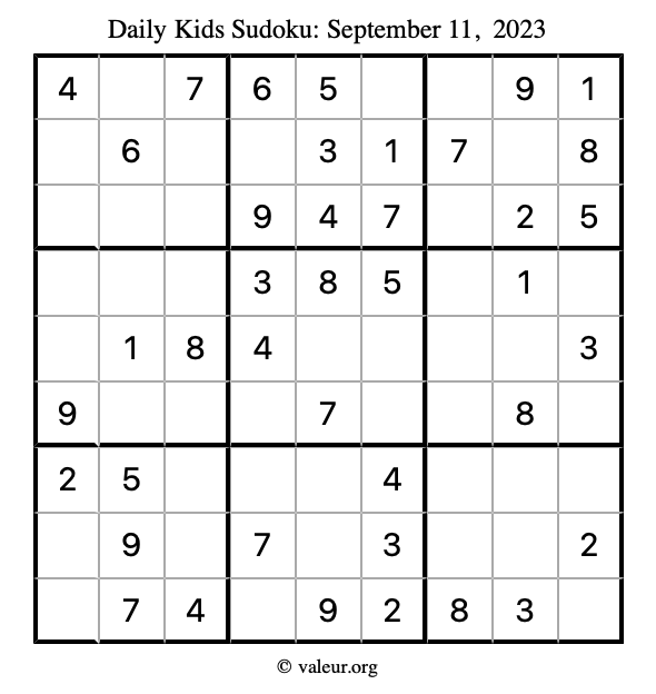 Here is the September 11, 2023 kids sudoku puzzle. You are welcome to print a copy to solve by hand. For your convenience, we have also included the solution further down the page so you can check your work.