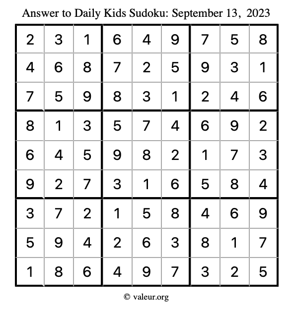 Here is the September 13, 2023 kids sudoku puzzle. You are welcome to print a copy to solve by hand. For your convenience, we have also included the solution further down the page so you can check your work.