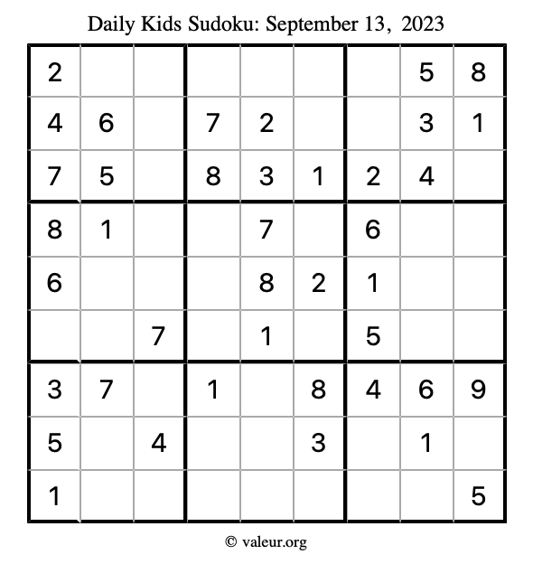 Kids Sudoku September 13, 2023 is not the only sudoku puzzle we have. We create a new kids sudoku puzzle every day for you to print and solve. Check out today's kids sudoku puzzle here!