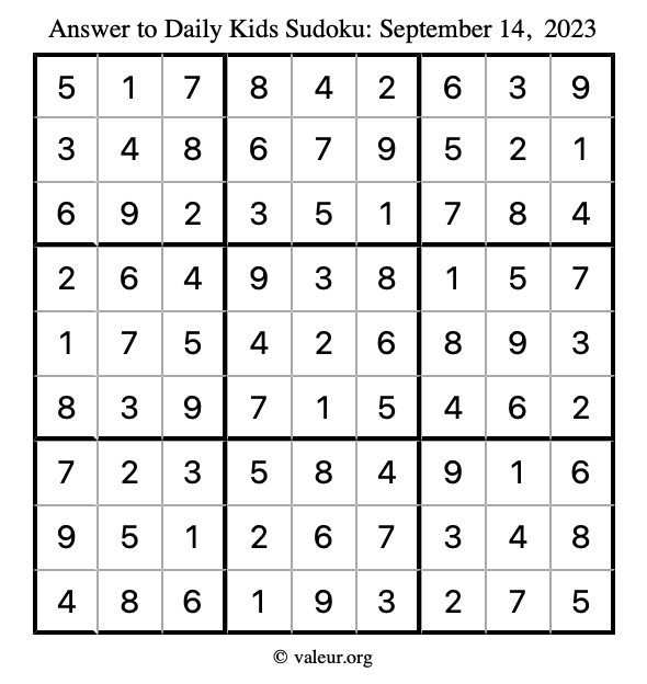 Kids Sudoku September 14, 2023 is not the only sudoku puzzle we have. We create a new kids sudoku puzzle every day for you to print and solve. Check out today's kids sudoku puzzle here!