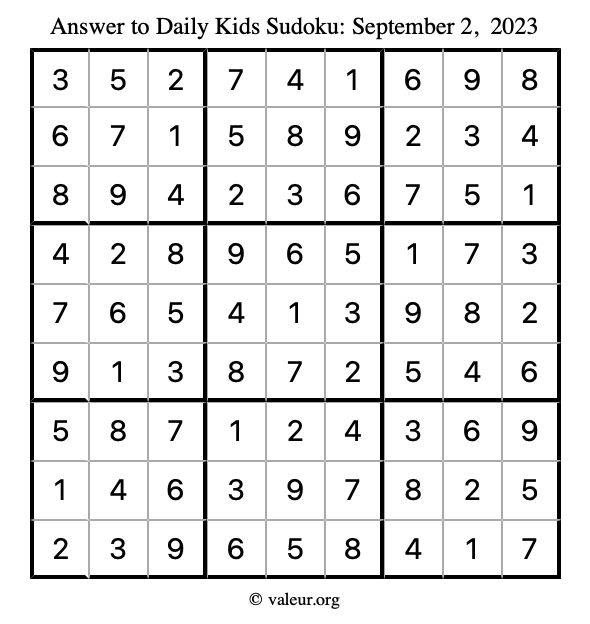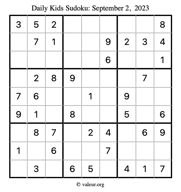 Here is the September 2, 2023 kids sudoku puzzle. You are welcome to print a copy to solve by hand. For your convenience, we have also included the solution further down the page so you can check your work.