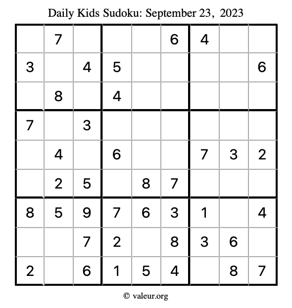 Here is the September 23, 2023 kids sudoku puzzle. You are welcome to print a copy to solve by hand. For your convenience, we have also included the solution further down the page so you can check your work.