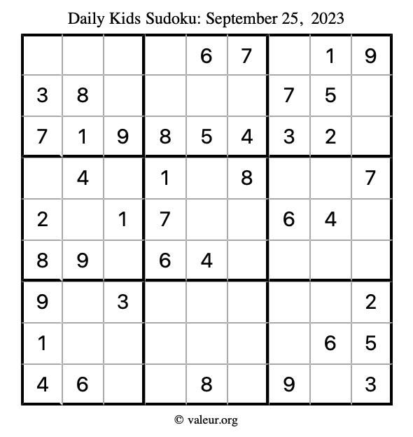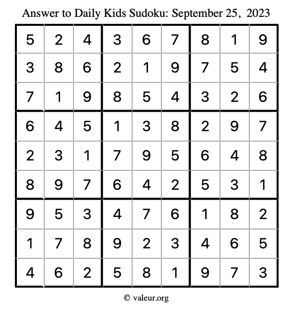 Here is the September 25, 2023 kids sudoku puzzle. You are welcome to print a copy to solve by hand. For your convenience, we have also included the solution further down the page so you can check your work.