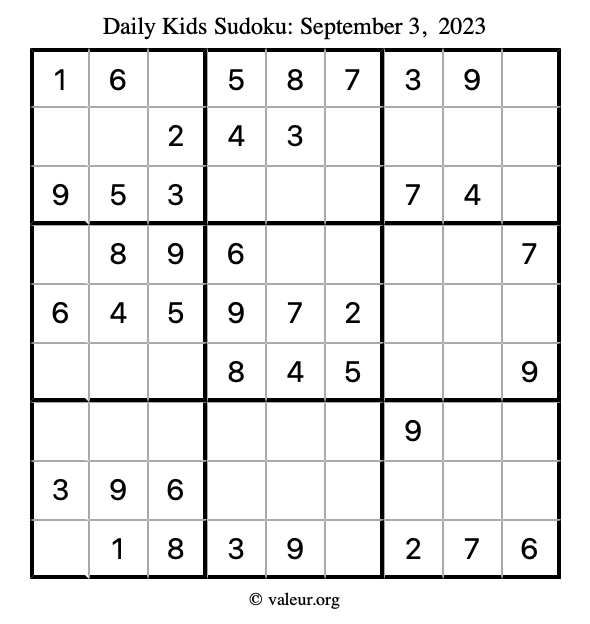 Here is the September 3, 2023 kids sudoku puzzle. You are welcome to print a copy to solve by hand. For your convenience, we have also included the solution further down the page so you can check your work.