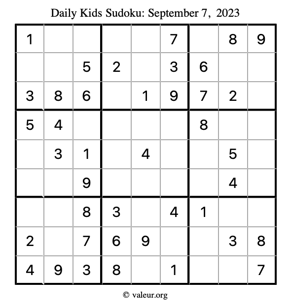 Kids Sudoku September 7, 2023 is not the only sudoku puzzle we have. We create a new kids sudoku puzzle every day for you to print and solve. Check out today's kids sudoku puzzle here!