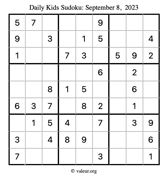 Here is the September 8, 2023 kids sudoku puzzle. You are welcome to print a copy to solve by hand. For your convenience, we have also included the solution further down the page so you can check your work.