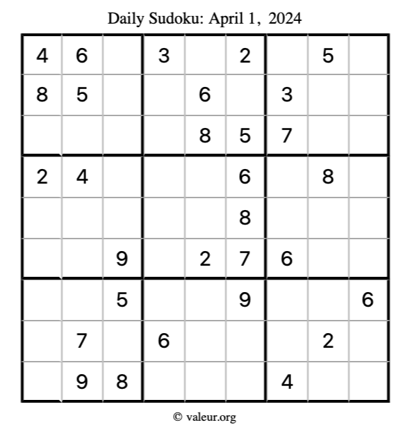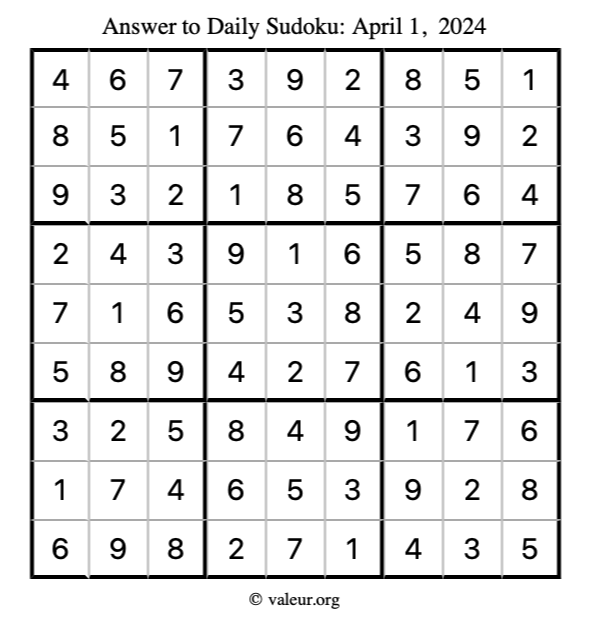 Here is the April 1, 2024 sudoku puzzle. You are welcome to print a copy to solve by hand. For your convenience, we have also included the solution further down the page so you can check your work.