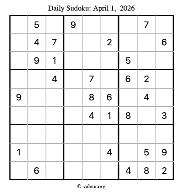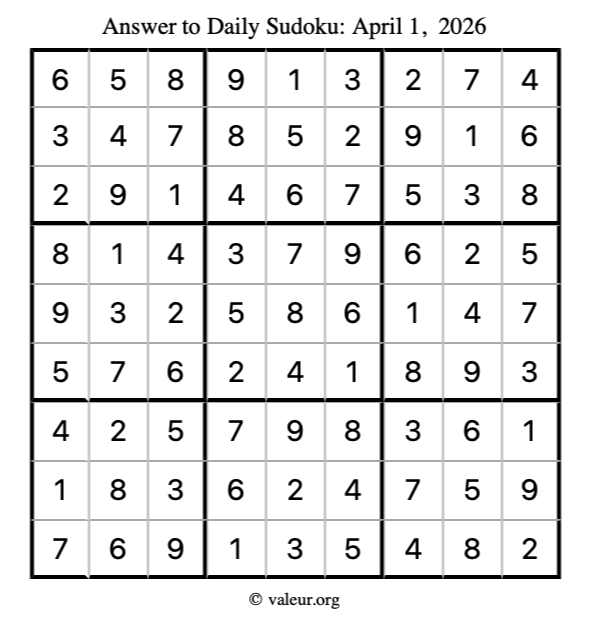 Here is the April 1, 2026 sudoku puzzle. You are welcome to print a copy to solve by hand. For your convenience, we have also included the solution further down the page so you can check your work.