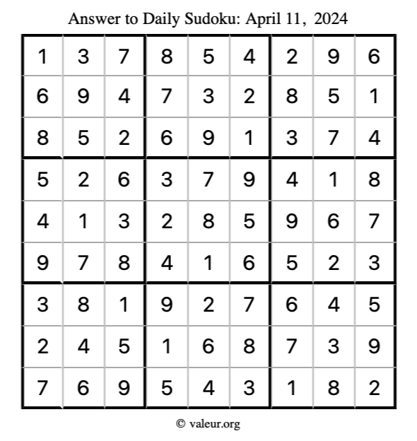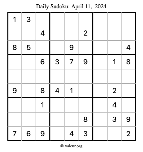 Here is the April 11, 2024 sudoku puzzle. You are welcome to print a copy to solve by hand. For your convenience, we have also included the solution further down the page so you can check your work.