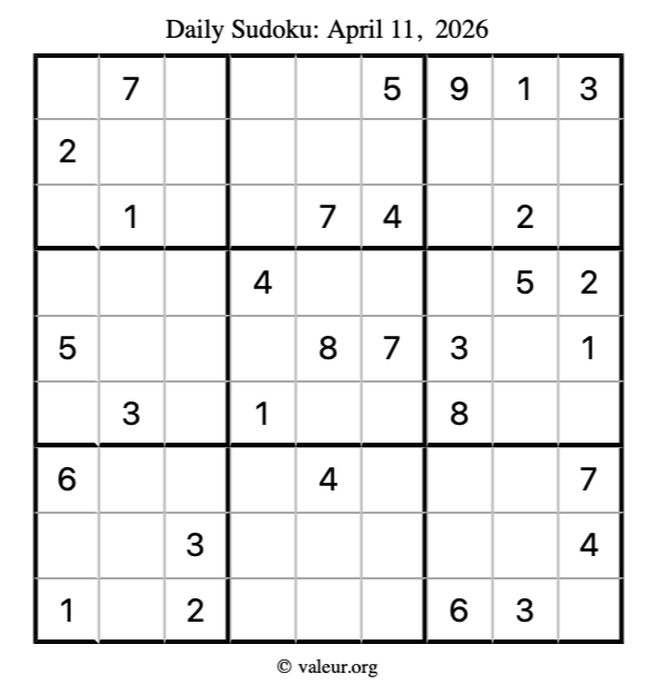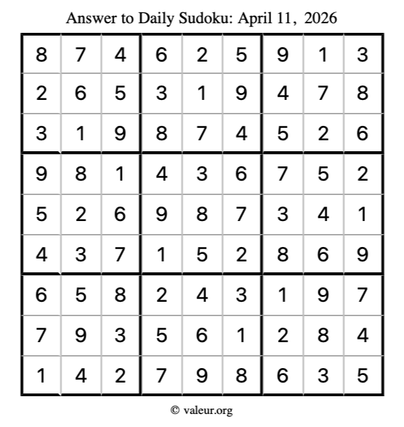Here is the April 11, 2026 sudoku puzzle. You are welcome to print a copy to solve by hand. For your convenience, we have also included the solution further down the page so you can check your work.