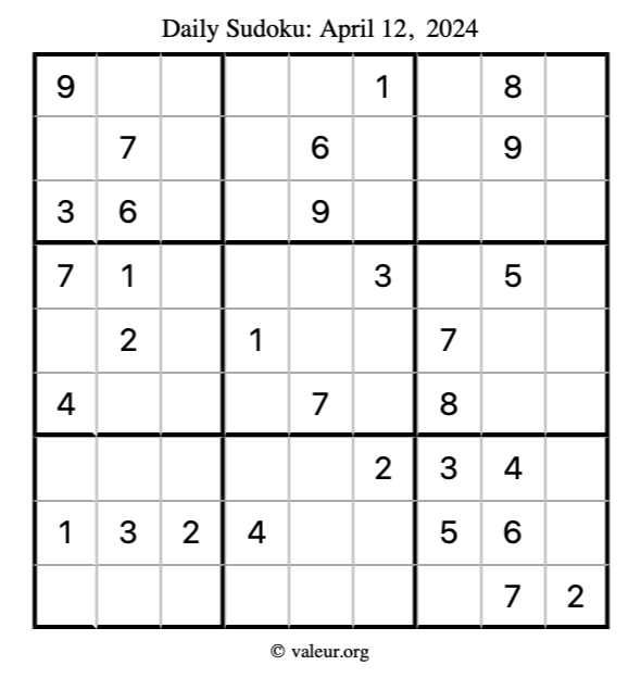 Here is the April 12, 2024 sudoku puzzle. You are welcome to print a copy to solve by hand. For your convenience, we have also included the solution further down the page so you can check your work.