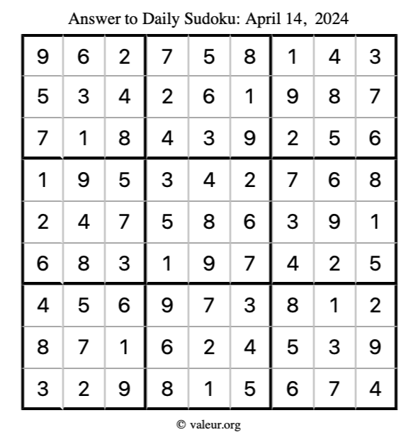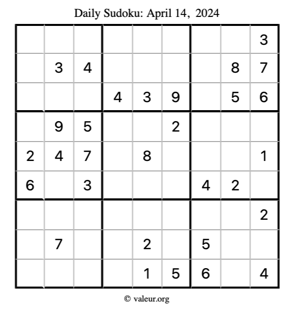 Here is the April 14, 2024 sudoku puzzle. You are welcome to print a copy to solve by hand. For your convenience, we have also included the solution further down the page so you can check your work.