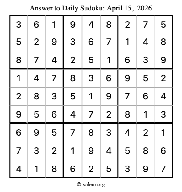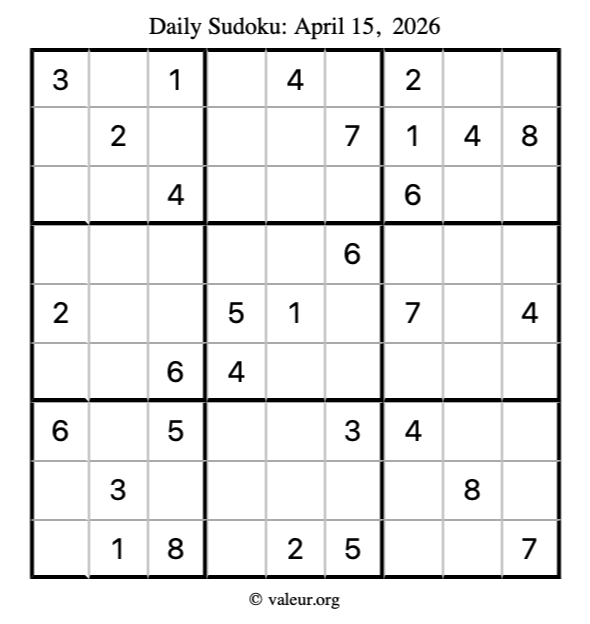 Here is the April 15, 2026 sudoku puzzle. You are welcome to print a copy to solve by hand. For your convenience, we have also included the solution further down the page so you can check your work.