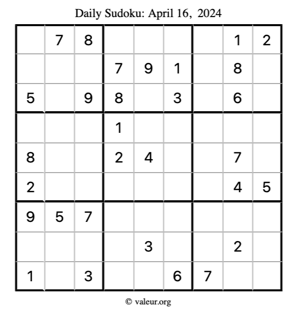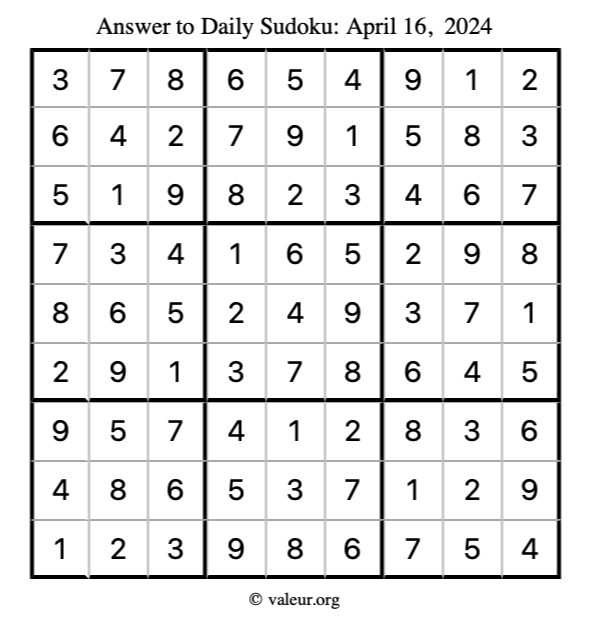 Here is the April 16, 2024 sudoku puzzle. You are welcome to print a copy to solve by hand. For your convenience, we have also included the solution further down the page so you can check your work.