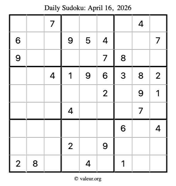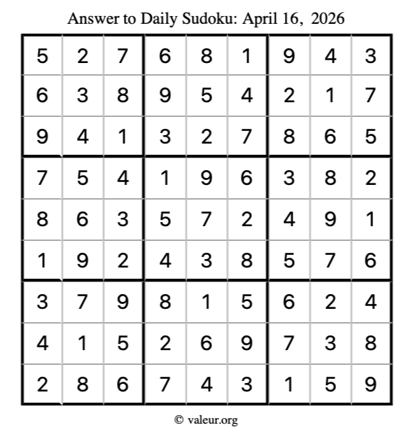 Here is the April 16, 2026 sudoku puzzle. You are welcome to print a copy to solve by hand. For your convenience, we have also included the solution further down the page so you can check your work.