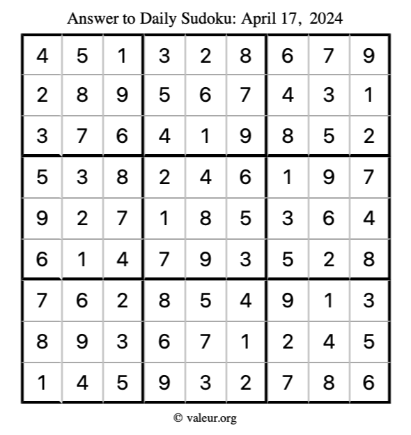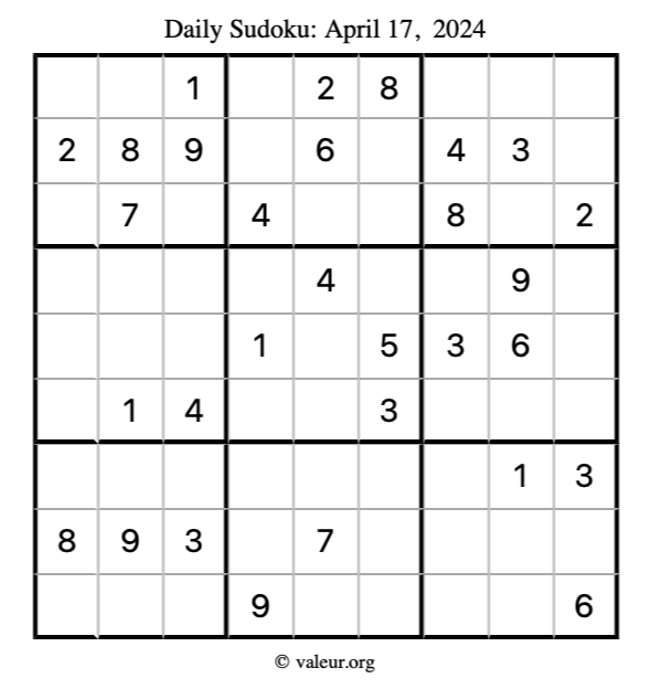 Here is the April 17, 2024 sudoku puzzle. You are welcome to print a copy to solve by hand. For your convenience, we have also included the solution further down the page so you can check your work.
