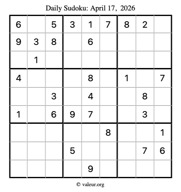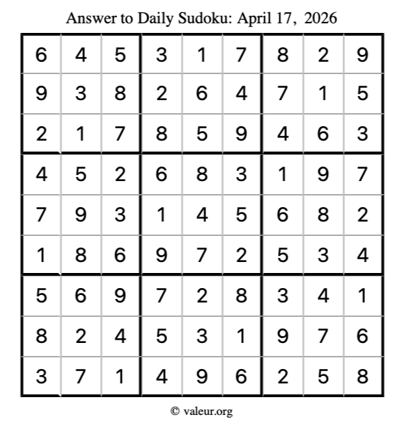 Here is the April 17, 2026 sudoku puzzle. You are welcome to print a copy to solve by hand. For your convenience, we have also included the solution further down the page so you can check your work.