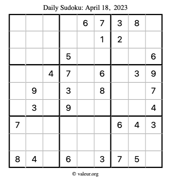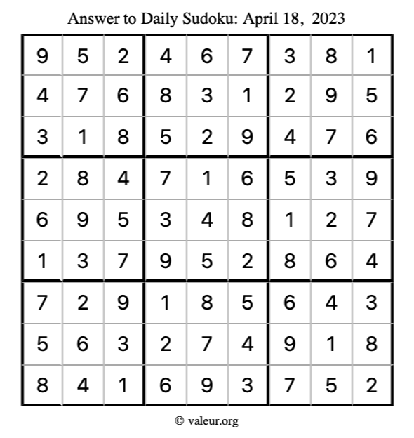 Here is the April 18, 2023 sudoku puzzle. You are welcome to print a copy to solve by hand. For your convenience, we have also included the solution further down the page so you can check your work.