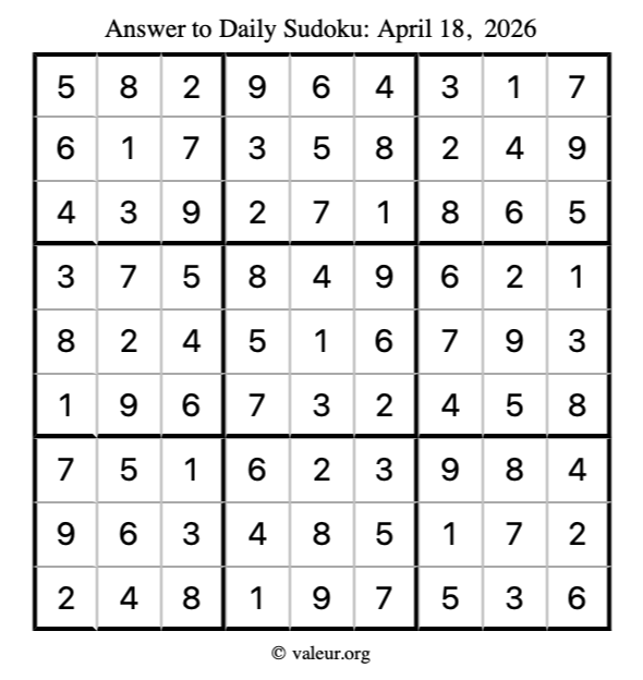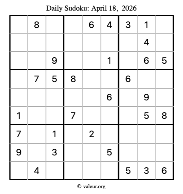 Here is the April 18, 2026 sudoku puzzle. You are welcome to print a copy to solve by hand. For your convenience, we have also included the solution further down the page so you can check your work.