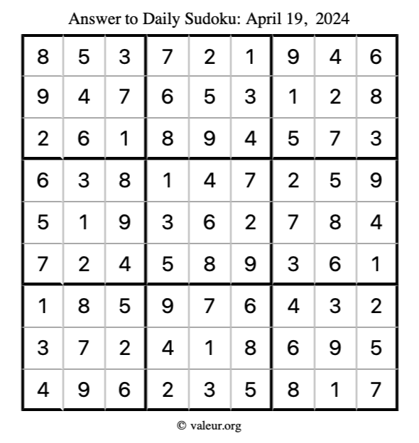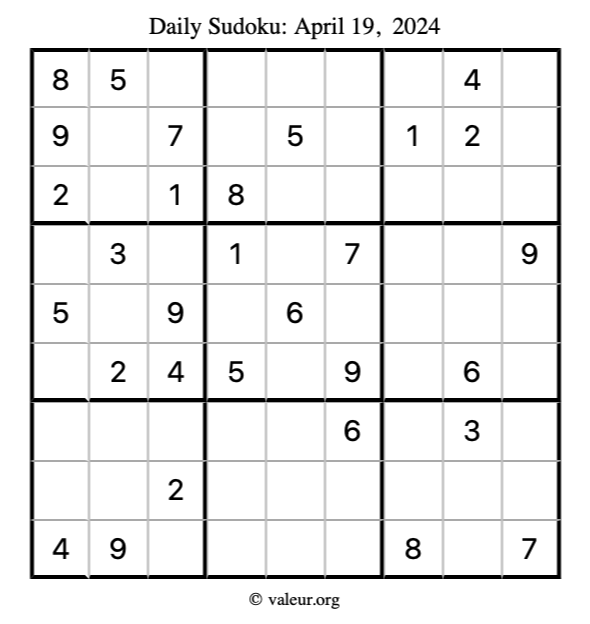 Here is the April 19, 2024 sudoku puzzle. You are welcome to print a copy to solve by hand. For your convenience, we have also included the solution further down the page so you can check your work.