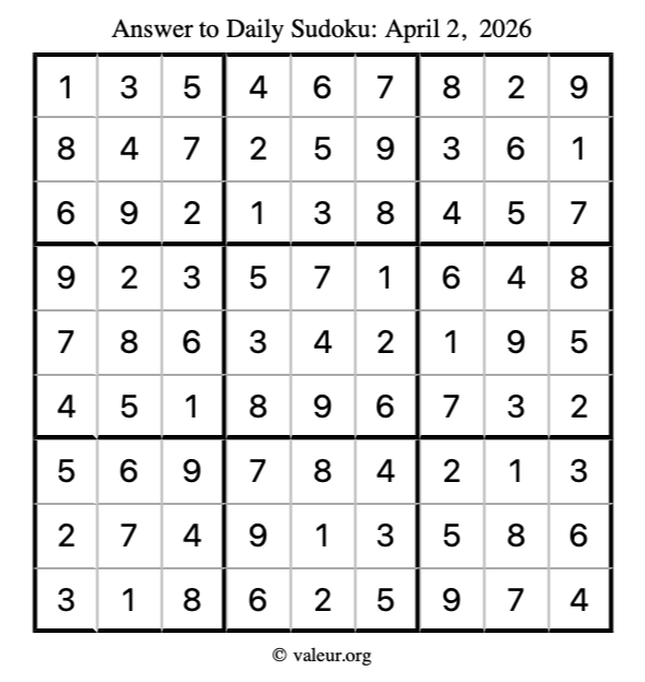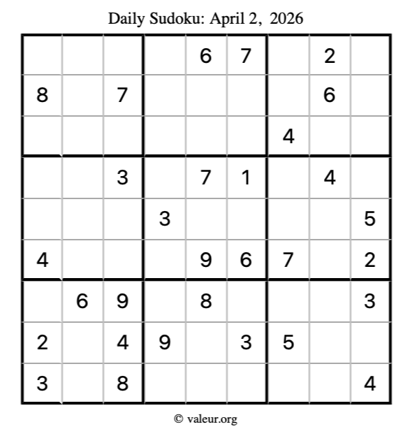 Here is the April 2, 2026 sudoku puzzle. You are welcome to print a copy to solve by hand. For your convenience, we have also included the solution further down the page so you can check your work.