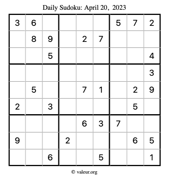 Here is the April 20, 2023 sudoku puzzle. You are welcome to print a copy to solve by hand. For your convenience, we have also included the solution further down the page so you can check your work.