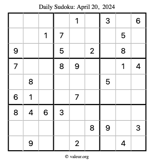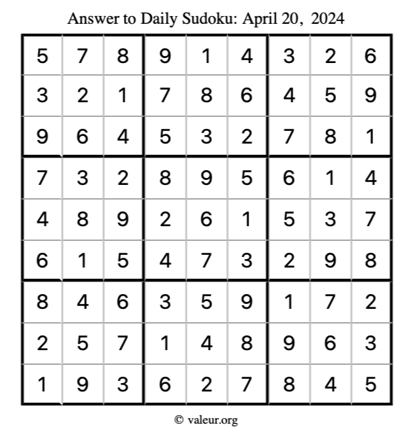 Here is the April 20, 2024 sudoku puzzle. You are welcome to print a copy to solve by hand. For your convenience, we have also included the solution further down the page so you can check your work.