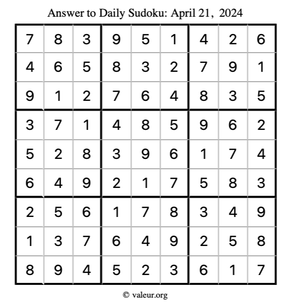 Here is the April 21, 2024 sudoku puzzle. You are welcome to print a copy to solve by hand. For your convenience, we have also included the solution further down the page so you can check your work.