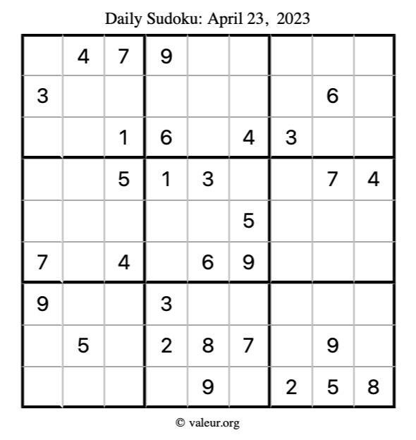 Here is the April 23, 2023 sudoku puzzle. You are welcome to print a copy to solve by hand. For your convenience, we have also included the solution further down the page so you can check your work.