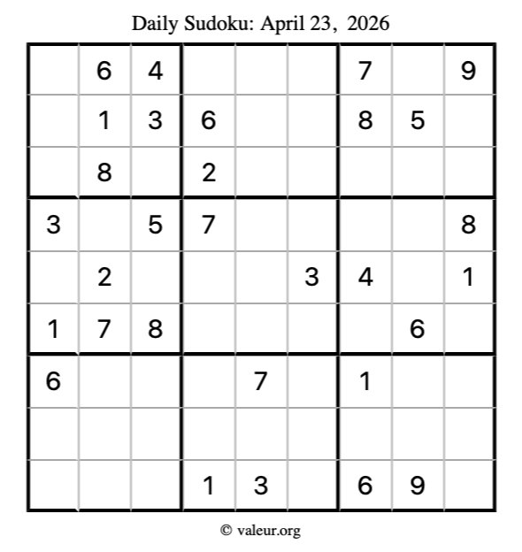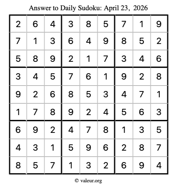 Here is the April 23, 2026 sudoku puzzle. You are welcome to print a copy to solve by hand. For your convenience, we have also included the solution further down the page so you can check your work.