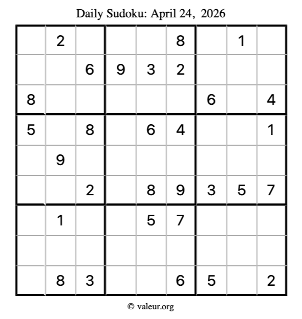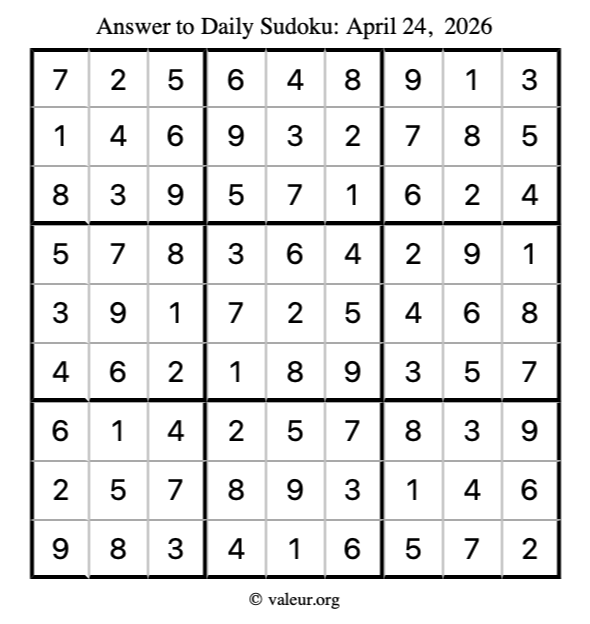 Here is the April 24, 2026 sudoku puzzle. You are welcome to print a copy to solve by hand. For your convenience, we have also included the solution further down the page so you can check your work.