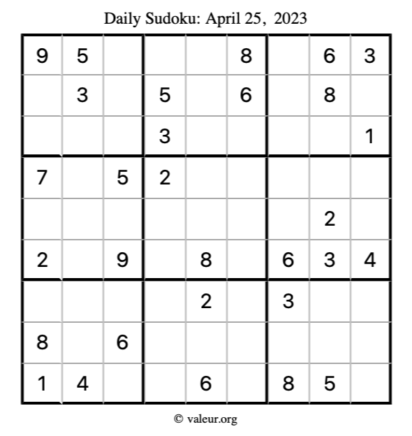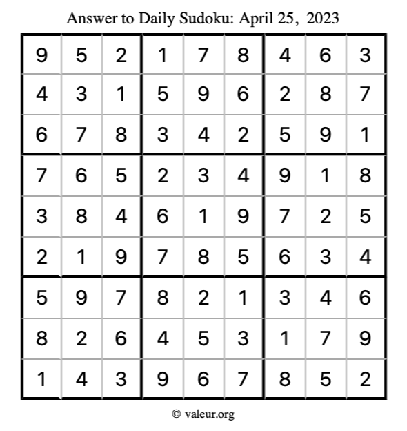 Here is the April 25, 2023 sudoku puzzle. You are welcome to print a copy to solve by hand. For your convenience, we have also included the solution further down the page so you can check your work.