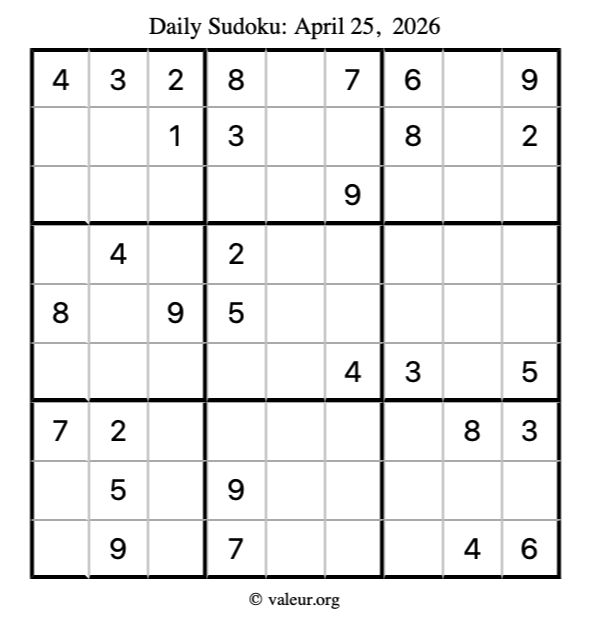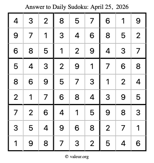 Here is the April 25, 2026 sudoku puzzle. You are welcome to print a copy to solve by hand. For your convenience, we have also included the solution further down the page so you can check your work.