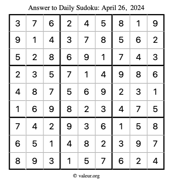 Here is the April 26, 2024 sudoku puzzle. You are welcome to print a copy to solve by hand. For your convenience, we have also included the solution further down the page so you can check your work.