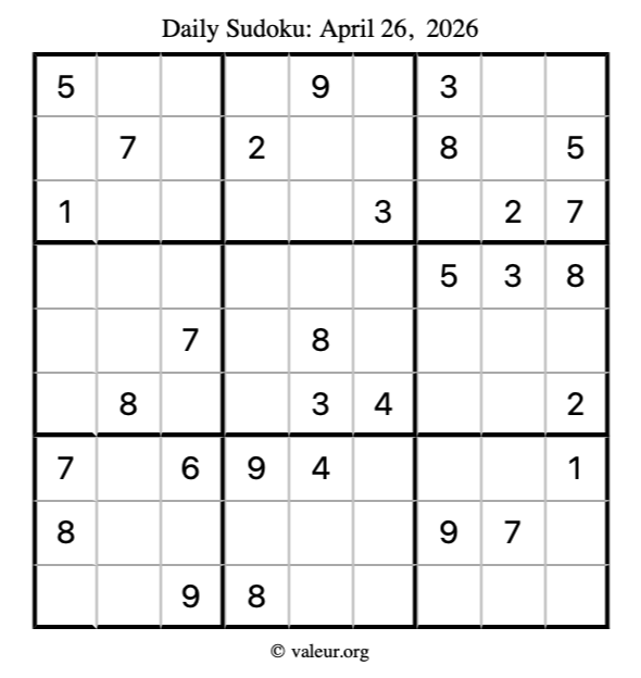 Here is the April 26, 2026 sudoku puzzle. You are welcome to print a copy to solve by hand. For your convenience, we have also included the solution further down the page so you can check your work.