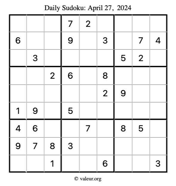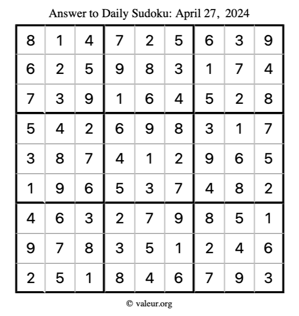 Here is the April 27, 2024 sudoku puzzle. You are welcome to print a copy to solve by hand. For your convenience, we have also included the solution further down the page so you can check your work.