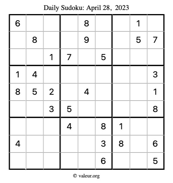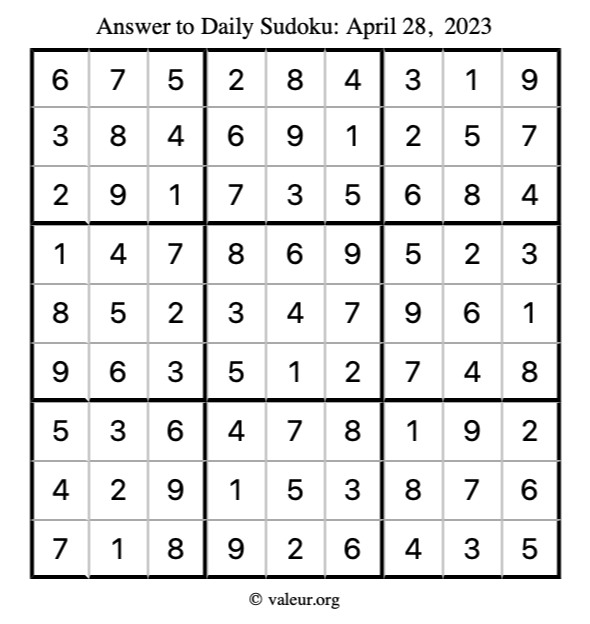 Here is the April 28, 2023 sudoku puzzle. You are welcome to print a copy to solve by hand. For your convenience, we have also included the solution further down the page so you can check your work.