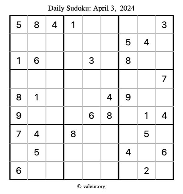 Here is the April 3, 2024 sudoku puzzle. You are welcome to print a copy to solve by hand. For your convenience, we have also included the solution further down the page so you can check your work.