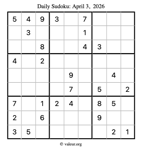 Here is the April 3, 2026 sudoku puzzle. You are welcome to print a copy to solve by hand. For your convenience, we have also included the solution further down the page so you can check your work.