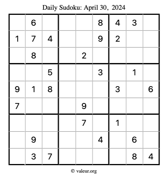 Here is the April 30, 2024 sudoku puzzle. You are welcome to print a copy to solve by hand. For your convenience, we have also included the solution further down the page so you can check your work.