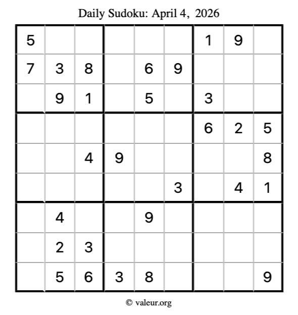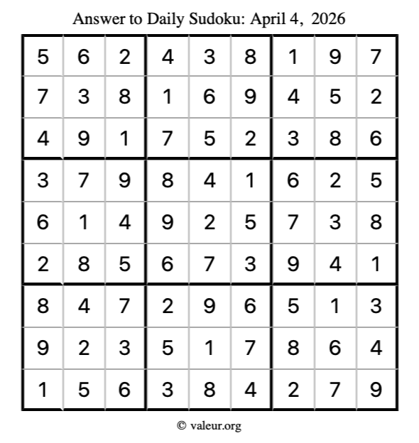 Here is the April 4, 2026 sudoku puzzle. You are welcome to print a copy to solve by hand. For your convenience, we have also included the solution further down the page so you can check your work.