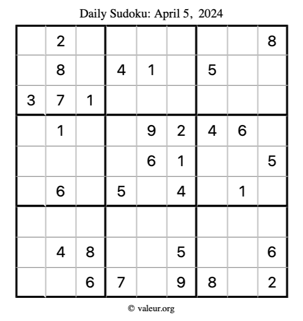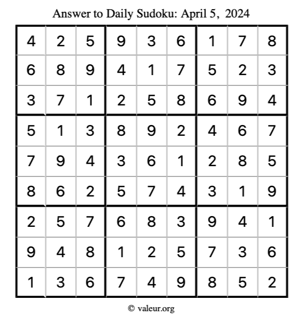 Here is the April 5, 2024 sudoku puzzle. You are welcome to print a copy to solve by hand. For your convenience, we have also included the solution further down the page so you can check your work.