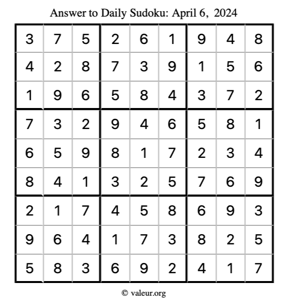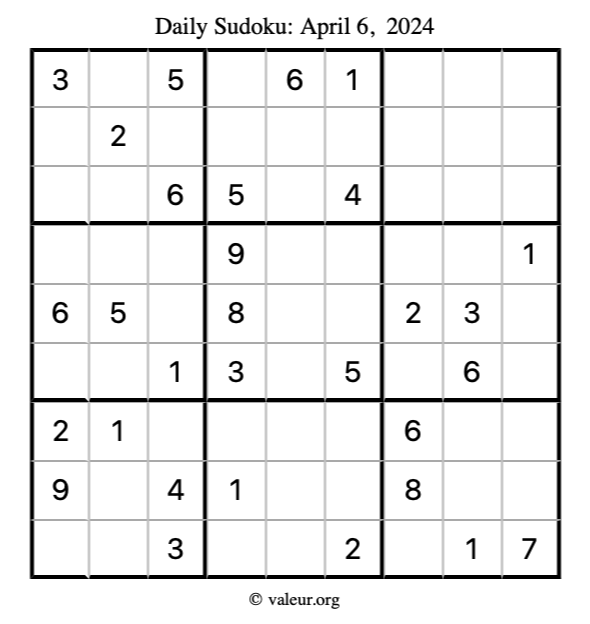 Here is the April 6, 2024 sudoku puzzle. You are welcome to print a copy to solve by hand. For your convenience, we have also included the solution further down the page so you can check your work.