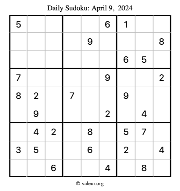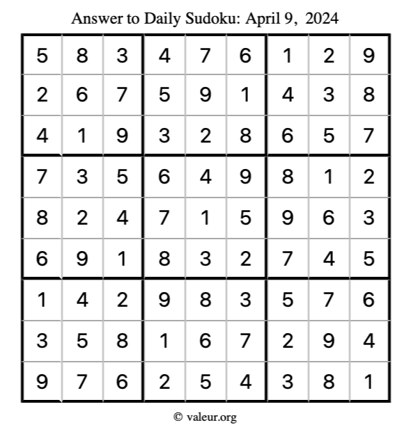 Here is the April 9, 2024 sudoku puzzle. You are welcome to print a copy to solve by hand. For your convenience, we have also included the solution further down the page so you can check your work.