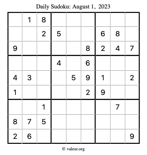 Here is the August 1, 2023 sudoku puzzle. You are welcome to print a copy to solve by hand. For your convenience, we have also included the solution further down the page so you can check your work.