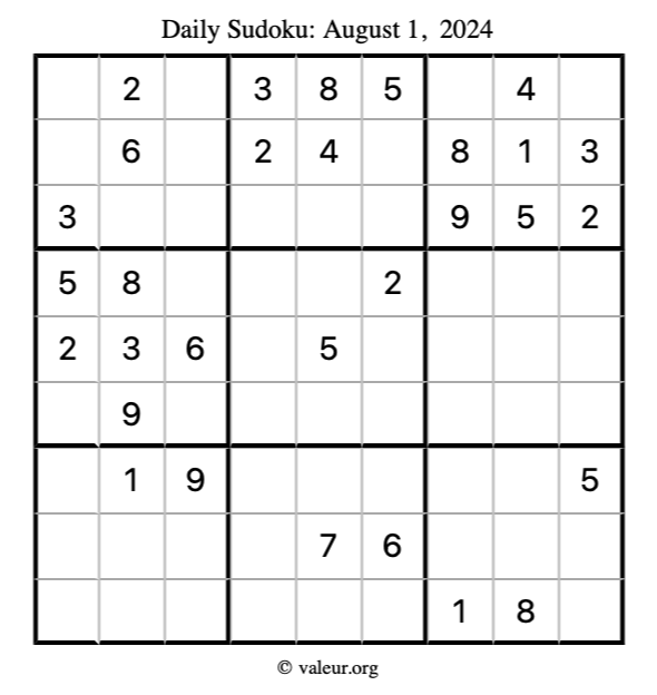 Here is the August 1, 2024 sudoku puzzle. You are welcome to print a copy to solve by hand. For your convenience, we have also included the solution further down the page so you can check your work.