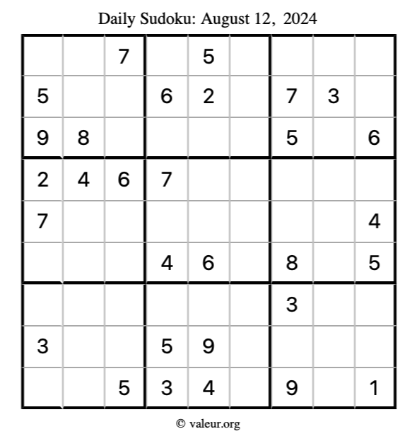 Here is the August 12, 2024 sudoku puzzle. You are welcome to print a copy to solve by hand. For your convenience, we have also included the solution further down the page so you can check your work.