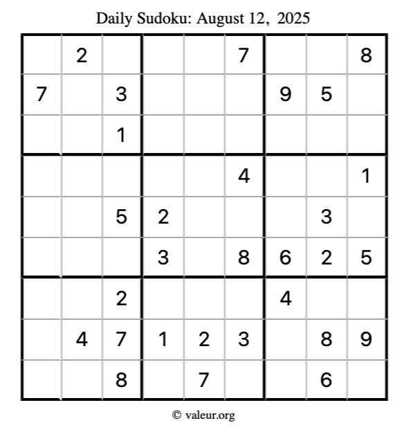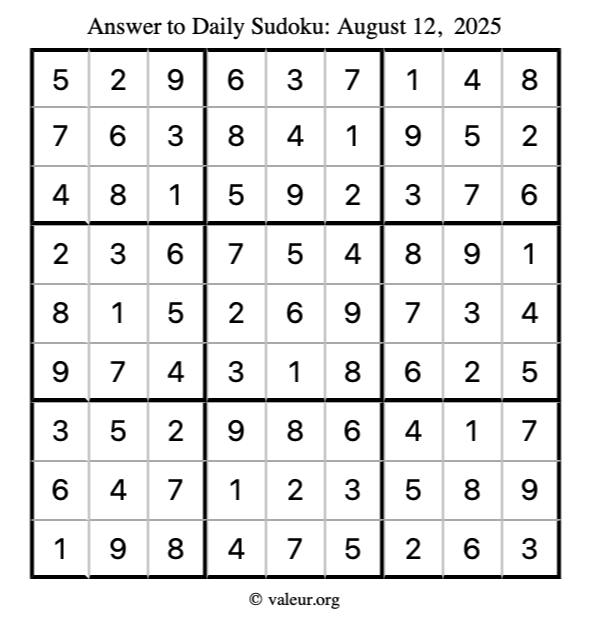 Here is the August 12, 2025 sudoku puzzle. You are welcome to print a copy to solve by hand. For your convenience, we have also included the solution further down the page so you can check your work.