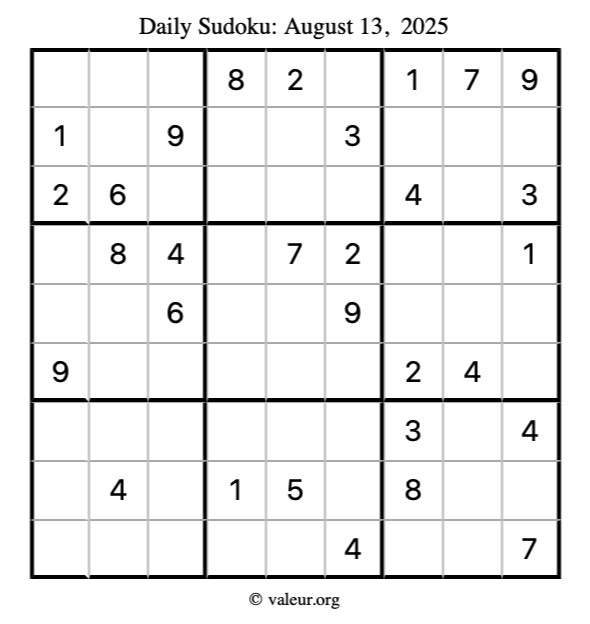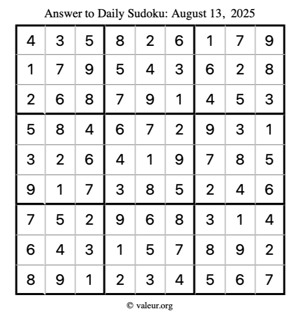 Here is the August 13, 2025 sudoku puzzle. You are welcome to print a copy to solve by hand. For your convenience, we have also included the solution further down the page so you can check your work.