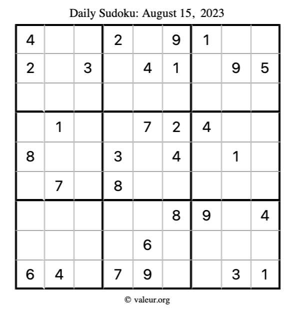 Here is the August 15, 2023 sudoku puzzle. You are welcome to print a copy to solve by hand. For your convenience, we have also included the solution further down the page so you can check your work.
